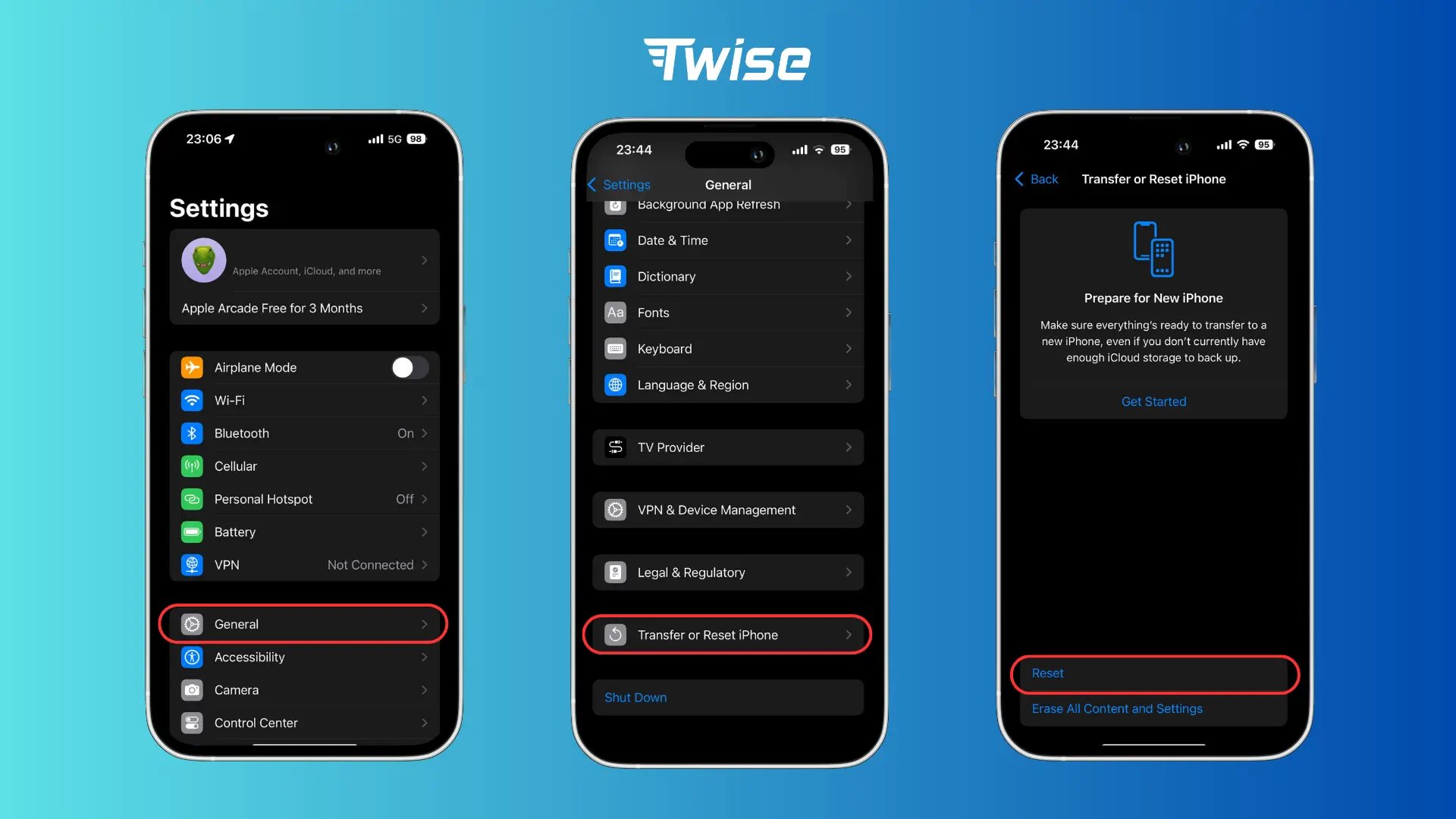- Open Settings > General > Transfer or Reset iPhone > Reset.